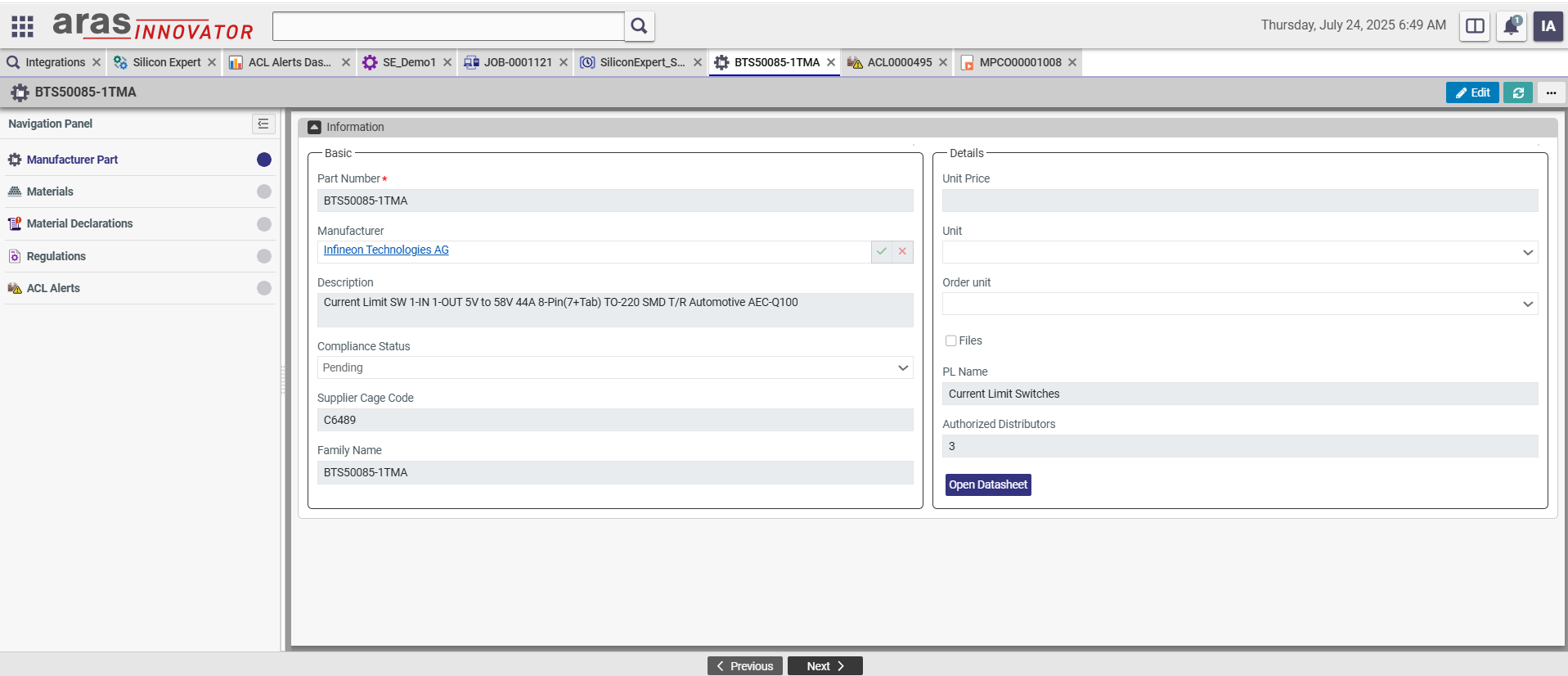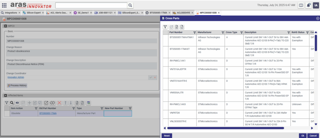 Access SiliconExpert’s extensive electronic component database directly within Aras Innovator. Search by part number, manufacturer, or keyword to quickly evaluate form-fit-function (FFF) alternatives